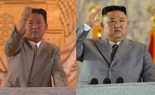 북한 김정은 국무위원장이 9일 평양 김일성광장에서 열린 정권 수립 73주년(9·9절) 기념 민간 및 안전 무력 열병식 행사를 지켜보며 오른손 엄지손가락을 치켜들고 있다. 오른쪽 사진은 지난해 10월 10일 조선노동당 창건 75주년 경축 열병식에 참석한 모습. /사진=조선중앙TV 연합뉴스 |