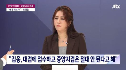 야당을 통한 여권 인사 고발 사주 의혹의 제보자임을 밝힌 조성은 전 미래통합당(현 국민의힘) 선거대책위원회 부위원장이 10일 오후 JTBC 뉴스룸에 출연해 수사기관에 제출한 증거자료를 들어보이고 있다. 연합뉴스 |