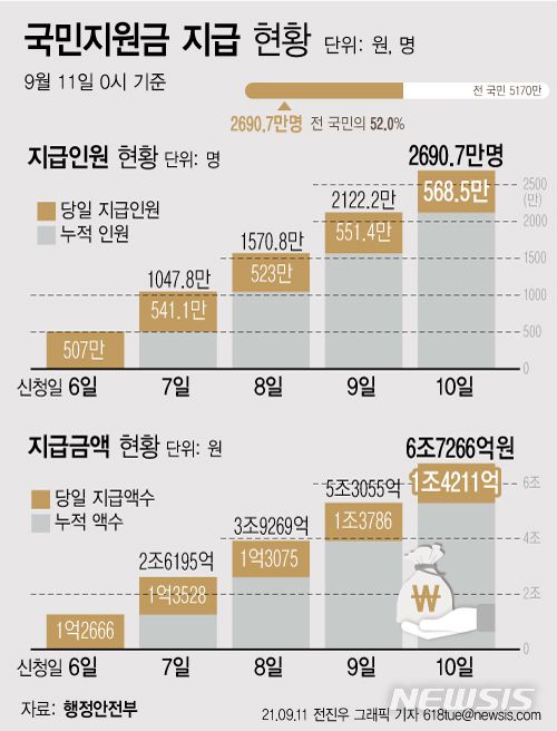 이로써 6~10일 닷새 동안 누적 2690만7000명에게 6조7266억원이 지급됐다.