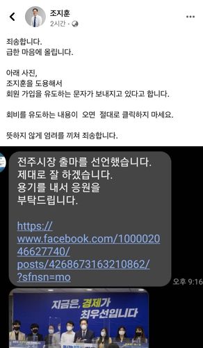 조 전 원장은 많은 지인으로부터 해당 메시지가 확산하고 있다는 말을 듣고 페이스북을 통해 "회원가입을 유도하는 문자가 보내지고 있다고 한다. 절대 클릭하지 말라"고 당부했다.