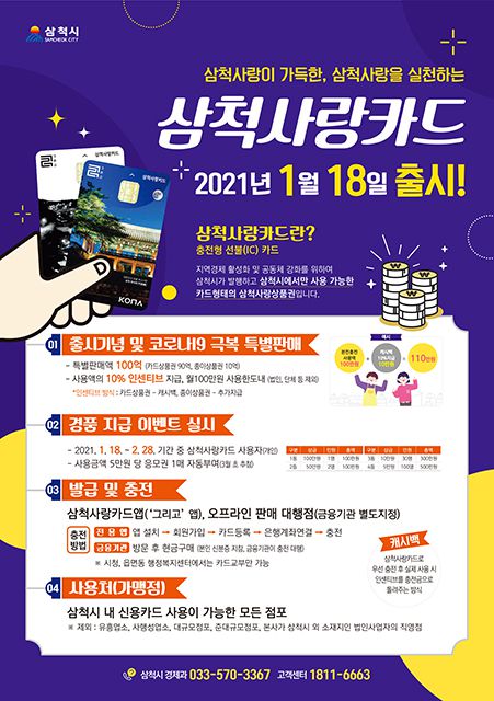 국민지원금의 방문접수는 오는 13일부터 10월 29일까지다. 지급수단은 신용‧체크카드 충전과 삼척사랑카드·삼척사랑상품권 중 선택할 수 있다. 삼척사랑카드 및 삼척사랑상품권을 원하는 사람은 주소지 읍면동 행정복지센터를, 신용‧체크카드충전을 원하는 사람은 카드사와 연계된 은행창구를 방문하면 된다. 단, 오프라인 경우 주말과 공휴일은 신청이 불가하다.