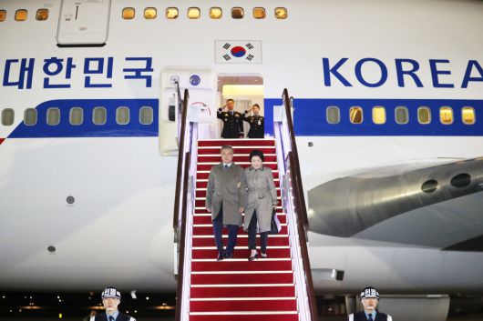 문재인 대통령과 부인 김정숙 여사가 16일 밤 아세안 3개국 국빈 방문을 마치고 경기도 성남 서울공항에 도착해 마중나온 더불어민주당 이해찬 대표와 김부겸 행정안전부 장관, 노영민 비서실장을 비롯한 인사들과 인사하고 있다. 연합뉴스 |