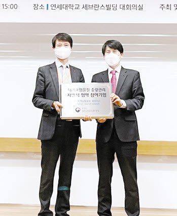 이상진 한국지역난방공사 화성지사장(왼쪽)이 지난 4월 14일 안세창 수도권대기환경청장과 ‘대기오염물질 총량관리 자발적 협약’ 체결 후 인증을 들어 보이고 있다. [사진 한국지역난방공사] |