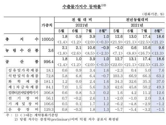 14일 한국은행이 발표한 '8월 수출입물가지수'에 따르면 8월 수출물가는 112.72(2015=100)로 전월대비 1.0% 올라 9개월 연속 상승했다. 수출물가지수는 2013년 8월(114.17) 이후 8년 만에 최고치를 기록했다. 전년동월대비로는 18.6% 올라 2009년 2월(22.9%) 이후 12년 6개월만에 가장 높았다. 수출물가가 오름세를 보인 것은 지난달 원·달러 평균환율이 1160.34으로 전월(1143.98원)보다 1.4% 상승한 데 따른 것이다.