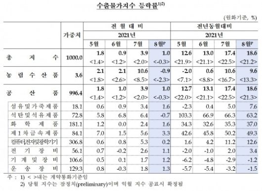 한국은행은 14일 '2021년 8월 수출입물가지수'에서 8월 수출물가가 전월 대비 1.0% 상승했다고 발표했다. 9개월 연속 상승이다. 전년 동월 대비로는 18.6% 상승한 수치다.