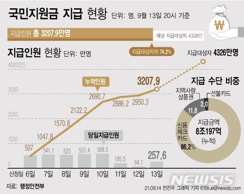 [세종=뉴시스] 변해정 기자 = '코로나 상생 국민지원금' 오프라인 신청 요일제 첫 날이던 지난 13일 257만6000명에게 6440억원이 지급됐다. 이로써 지급 대상자의 74.2%인 3207만9000명이 국민지원금을 받았다.