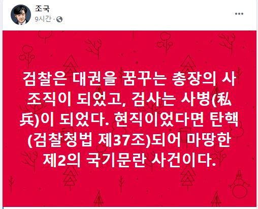 조 전 장관은 14일 페이스북에 "검찰은 대권을 꿈꾸는 총장의 사조직이 되었고, 검사는 사병(私兵)이 되었다"며 이같이 적었다.