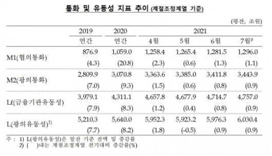 한국은행이 14일 발표한 '2021년 7월중 통화 및 유동성'에 따르면, 7월 M2(광의통화)(계절조정계열, 평잔 기준)는 3443조9000억원으로 전달보다 32조1000억원(0.9%) 증가했다.