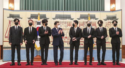 문재인 대통령이 14일 청와대 본관에서 ‘미래 세대와 문화를 위한 대통령 특별사절’로 임명한 그룹 BTS 멤버들과 기념촬영을 하며 박수를 치고 있다. 왼쪽부터 뷔, 제이홉, 진, 문 대통령, RM, 슈가, 지민, 정국. 청와대사진기자단 ⓒ 세상을 보는 눈, 세계일보