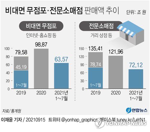 반면 거리 상점인 전문소매점 판매액은 올해 1∼7월 72조1천180억원으로 2019년 같은 기간의 78조7천410억원보다 9.1%(6조6천230억원) 감소했다.
