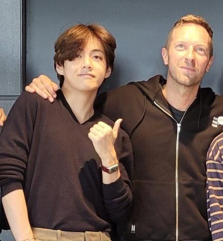 크리스 마틴의 옆에서 엄지를 치켜 세우고 있는 뷔는 잘 알려진 콜드플레이의 팬이다.
