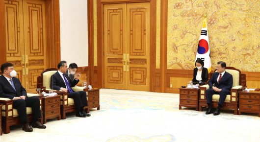 방한중인 왕이 부장은 이날 청와대에서 문 대통령을 예방하고 한중 양국의 협력을 강조하며 이같이 말했다.