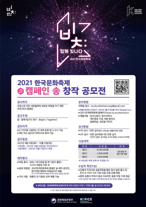 코로나19 극복을 위한 캠페인송은 ‘2021 한국문화축제 캠페인 송 창작 공모전’(포스터)을 통해 만들어진다. 음원 공모 주제는 올해 축제 슬로건인 ‘빛 : 함께 빛나다’로, 전 세계 한류 팬이라면 누구나 지원할 수 있다.