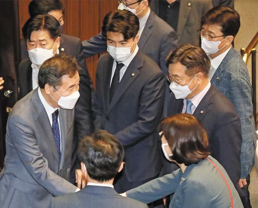 더불어민주당 이낙연 전 대표(맨 왼쪽)가 15일 국회 본회의에서 자신의 사직안에 대한 투표를 마친 뒤 동료 의원들과 인사를 하고 있다. /국회사진기자단 |