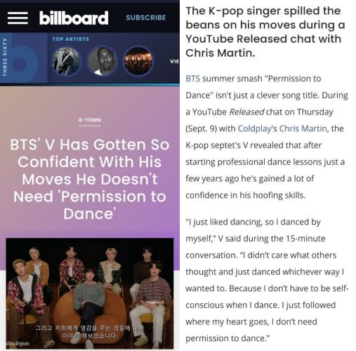 빌보드는 “BTS V가 댄스에 자신감을 얻으면서 댄스에는 허락이 필요 없게 됐다”는 기사를 통해 뷔와 크리스 마틴이 댄스는 “스스로 자유로워지며 마음이 가는대로 하는 것이 중요하다”며 서로 공감하는 장면을 실었다.
