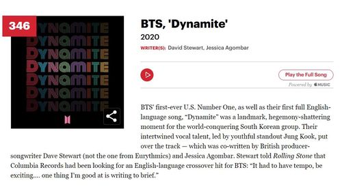 '다이너마이트'는 이 목록에서 346위로 선정됐다.