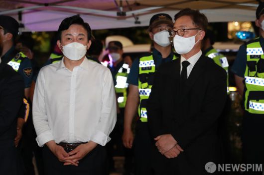 [서울=뉴스핌] 이형석 기자 = 국민의힘 대선 예비후보인 원희룡 전 제주지사와 최재형 전 감사원장이 16일 오후 서울 여의도 국회의사당역 인근에 마련된 자영업자 합동 분향소에 자리하고 있다. 2021.09.16 leehs@newspim.com 저작권자(c) 글로벌리더의 지름길 종합뉴스통신사 뉴스핌(Newspim), 무단 전재-재배포 금지