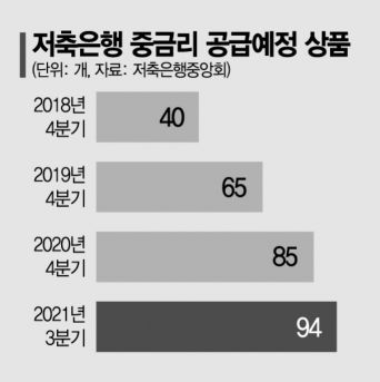 반면 저축은행은 금융당국의 ‘당근’덕에 파격적인 중금리 상품을 공급하고 있다. 업계 1위인 SBI저축은행은 최근 신용대출 상품인 ‘79대출’을 출시했다. 최저 연 7.5~9.4%를 고정금리로 제시하는데 대출한도가 최대 1억원이다. 만 20세가 넘거나 신용점수 670점 이상인 중저신용자가 대상이다. ES저축은행은 최저금리가 4.8%인 ES니즈론 상품을 출시했다. 소득증빙이 가능한 급여소득자를 위한 중금리 대출상품이다. 한도는 100만~1억원에 이른다.