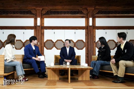 문재인 대통령이 지난 14일 청와대 상춘재에서 제2회 청년의날 기념 대담을 하고 있다. 대담 영상은 제2회 청년의 날인 18일에 청와대 유튜브 등을 통해 공개될 예정이다. 배성재 아나운서 진행으로 윤태진 아나운서, 브레이브걸스 리드보컬 민영, 래퍼 한해가 대담에 참석했다. 청와대 제공 |