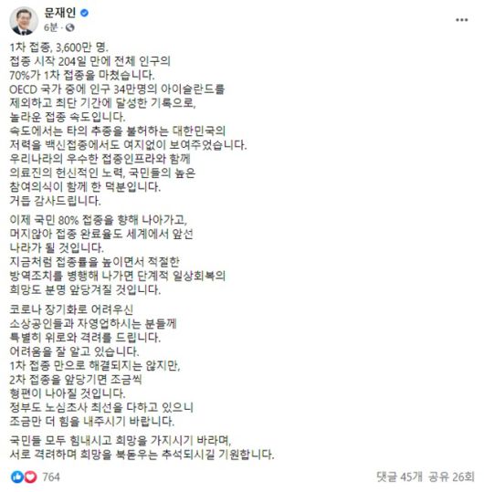 문 대통령은 이날 오후 SNS를 통해 이같이 밝히면서 "속도에서는 타의 추종을 불허하는 대한민국의 저력을 백신 접종에서도 여지없이 보여주었다. 우리나라의 우수한 접종 인프라와 함께 의료진의 헌신적인 노력, 국민들의 높은 참여 의식이 함께한 덕분이다. 거듭 감사드린다"고 했다.