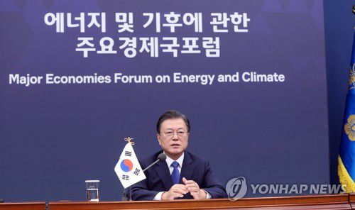 (서울=연합뉴스) 임형섭 기자 = 문재인 대통령은 17일 에너지 및 기후에 관한 주요경제국포럼(MEF)에 참석해 "한국은 국민, 정부, 기업, 지자체가 함께 저탄소 경제 전환을 위한 최선의 방향을 모색하고 있다"고 말했다.