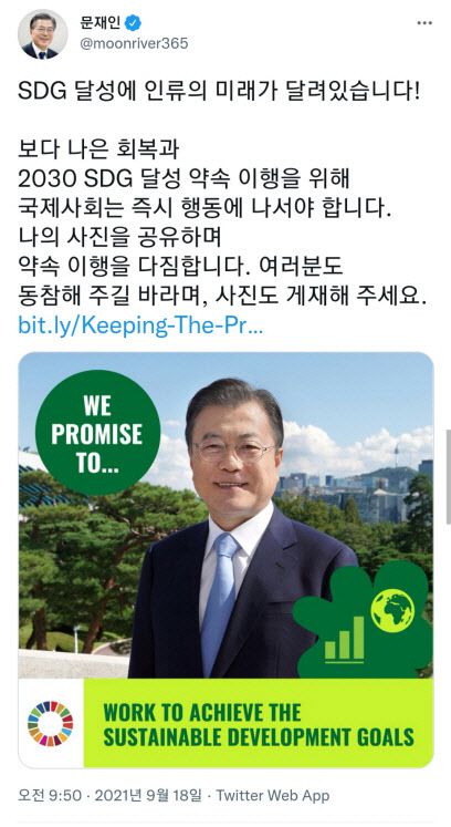 문 대통령은 18일 SNS 메시지를 통해 “보다 나은 회복과 2030 SDG 달성 약속 이행을 위해 국제사회는 즉시 행동에 나서야 한다”며 “내 사진을 공유하며 약속 이행을 다짐한다”고 말했다.