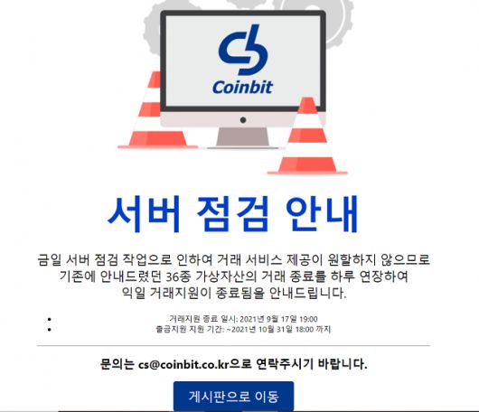 앞서 코인빗은 지난 16일 오후 4시께 "서버 상태가 불안정해 긴급 점검을 진행한다"며 긴급 서버 점검을 위해 서비스 이용을 제한했다. 이는 금융당국이 영업 종료 관련 사실을 이용자들에게 공지해달라고 요청한 기한을 하루 남긴 시점이다.