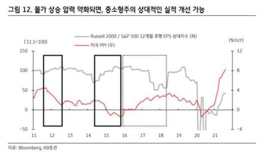물가 상승 압력이 약해지고 기업들의 가격 전가도 마무리되면, 기업 마진과 이익 흐름에도 변화가 생길 것으로 전망된다. 이익 측면에서는 대형주보다 중소형주에 더 유리한 환경이 조성될 것으로 예상됐다. 안 연구원은 "그동안 적극적으로 가격 전가를 했던 대형주 입장에서는 가격 인상의 명분이 사라지는 반면, 상대적으로 가격 전가가 어려웠던 중소형주 입장에서는 마진 악화 리스크가 해소되기 때문"이라고 전했다.