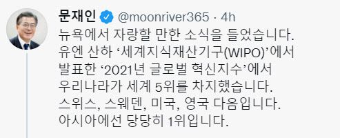 [이데일리 김정현 기자] 문재인 대통령이 20일(현지시간) “뉴욕에서 자랑할 만한 소식을 들었다”며 “유엔 산하 ‘세계지식재산기구(WIPO)’에서 발표한 ‘2021년 글로벌 혁신지수’에서 우리나라가 세계 5위를 차지했다”고 축하했다.