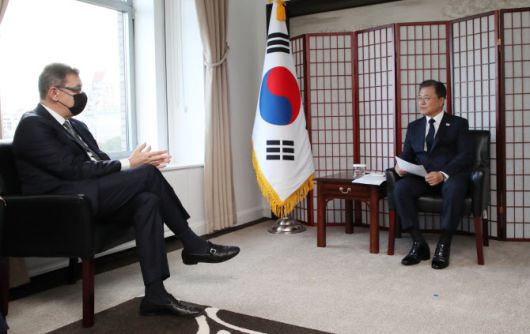 문재인 대통령이 21일(현지시각) 미국 뉴욕 시내 호텔에서 앨버트 불라 화이자 최고경영자(CEO)f를 접견하고 있다. (사진=연합뉴스) |