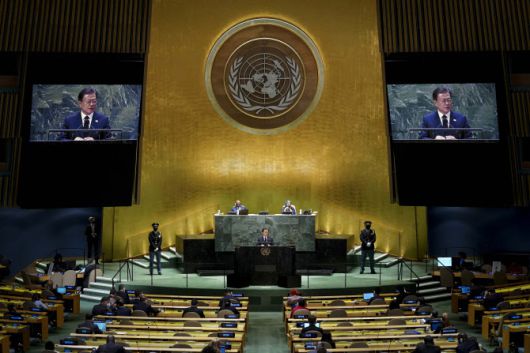 문재인 대통령이 21일(현지시각) 미국 뉴욕 유엔 총회장에서 기조연설을 하고 있다. (사진=연합뉴스) |