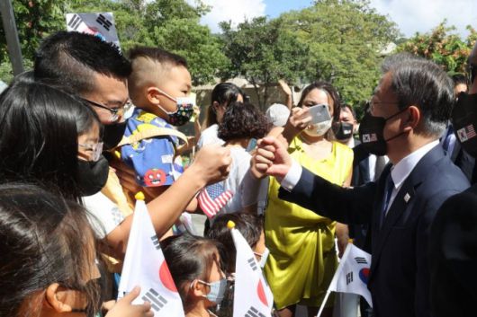 문재인 대통령과 김정숙 여사가 22일(현지시간) 하와이 호놀룰루에 있는 '펀치볼 국립묘지'(국립 태평양 기념묘지) 참배하며 미국 순방 마지막 날 일정을 시작하자, 수십명의 교민들이 나와 문 대통령 내외를 환영했다. 교민들은 태극기를 흔들며 응원했고, 일부 교민들은 문 대통령 내외를 스마트폰 사진으로 찍었다.