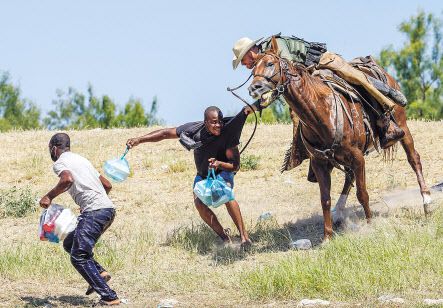 미국 국경수비대가 지난 19일(현지시간) 텍사스주 남서부의 델리오 인근 리오그란데 강을 건너온 아이티 난민을 말고삐로 쫓아내고 있다. [AFP] |