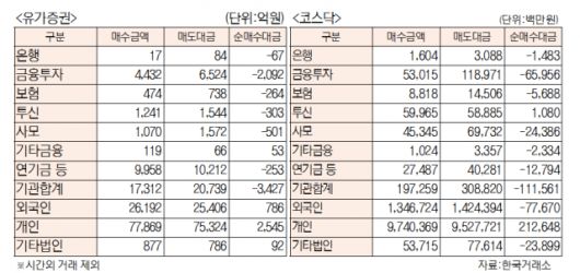 [표]유가증권 코스닥 투자주체별 매매동향(9월 24일)