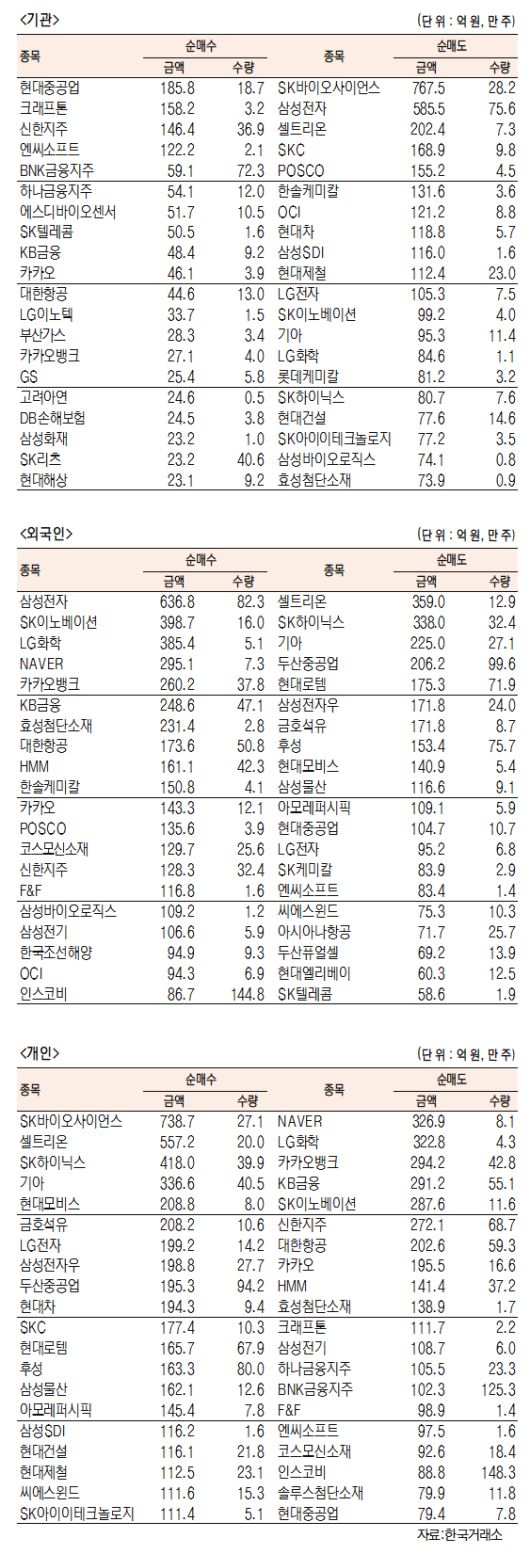 [표]유가증권 기관·외국인·개인 순매수·도 상위종목(9월 24일-최종치)