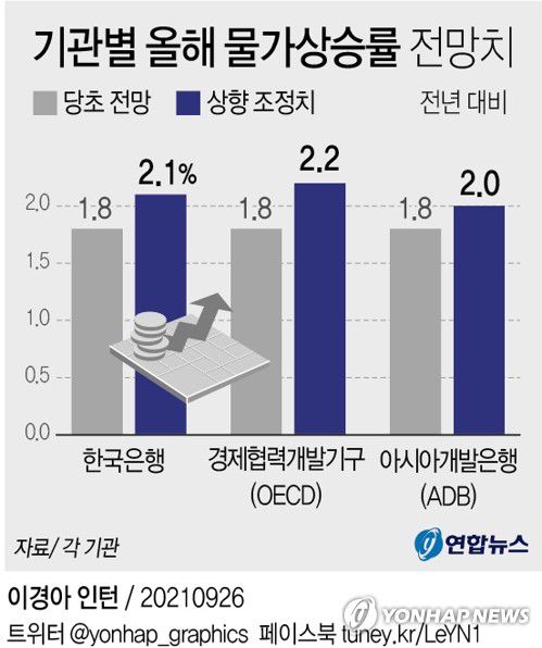 한국은행은 지난달 올해 물가상승률 전망치를 1.8%에서 2.1%로 올렸다. 경제협력개발기구(OECD)는 1.8%에서 2.2%로, 아시아개발은행(ADB)은 1.8%에서 2.0%로 각각 상향했다.
