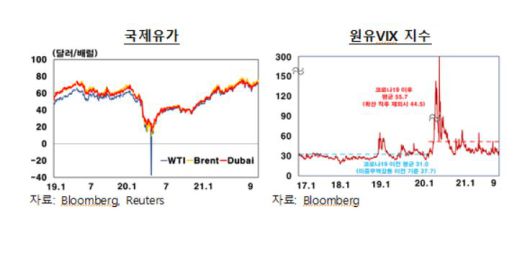 임상은 한은 국제종합팀 과장은 "유가 모형을 통한 전망 결과 국제유가는 올해 하반기 중 배럴당 70달러 내외 수준을 보이다가 내년 이후 완만하게 안정화될 것"이라며 "다만 변이 바이러스 확산, 달러화 강세 등의 하방요인과 생산차질 회복 지연, 이상한파 가능성 등의 상방요인이 교차하면서 향후 유가 흐름에 대한 불확실성은 여전히 큰 것으로 평가된다"고 설명했다.