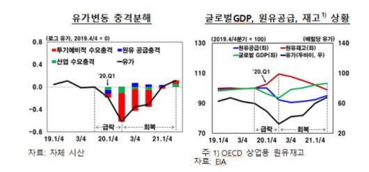 한은은 이를 종합적으로 판단해 코로나19 확산 이후 국제유가 결정요인이 비관적 기대(투기·예비적 수요 감소)가 급격히 확산된 후 진정 및 소멸되는 과정에서 크게 변동한 것으로 식별했다.