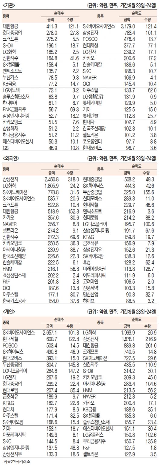 [표]주간 유가증권 기관·외국인·개인 순매수·도 상위종목(9월 23~24일)