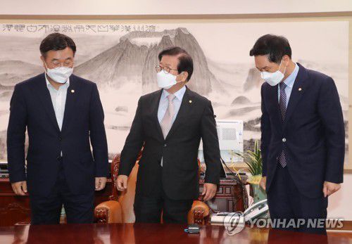 26일 국회에 따르면 이날 '8인 협의체' 마지막 회의가 소득없이 종료된 직후 민주당 윤호중 원내대표와 국민의힘 김기현 원내대표는 박병석 국회의장 주재로 의장 공관에서 회동을 하고 본회의 의사일정을 논의했다.