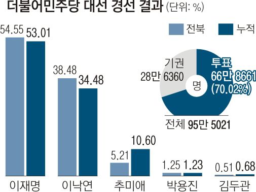 26일 전북 경선에서 이 지사가 1위를 차지하며 누적 득표율 53.01%를 기록했다. 전날 패배에도 과반을 유지하던 이 지사는 이날 다시 과반을 넘어서며 이 전 대표의 추격을 따돌렸다. 이 지사는 첫 경선지인 대전·충남에서 더블스코어로 이 전 대표를 눌렀고, 연거푸 과반을 달성하며 5연승을 이어 왔다. 전날 46.95%로 1위 자리를 내줬으나 하루 만에 반등했다. 이재명 캠프 홍정민 선임대변인은 논평에서 “지금까지 당원과 선거인단은 안정적인 과반 지지율로 이재명 후보를 공정한 대한민국, 성장과 기회를 가져올 적임자로 선택했다”고 평가했다.