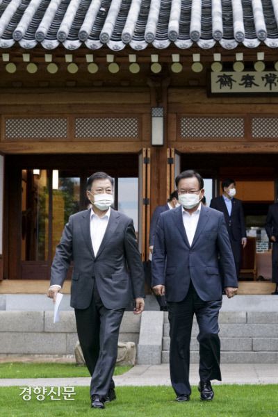 문재인 대통령과 김부겸 국무총리가 지난 5월17일 청와대 상춘재에서 첫 주례회동을 한 뒤 함께 걸어나오고 있다. 청와대 제공 |