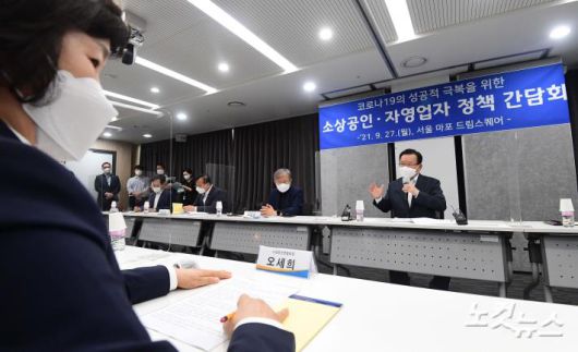 소상공인·자영업자 정책간담회 김부겸 국무총리가 27일 서울 마포 드림스퀘어에서 열린 코로나19의 성공적 극복을 위한 소상공인·자영업자 정책 간담회에서 모두발언을 하고 있다. 사진 왼쪽은 오세희 소상공인연합회장.저작권자 © CBS 노컷뉴스 무단전재 및 재배포 금지