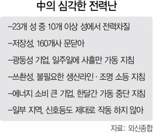 26일(현지 시간) 블룸버그통신은 이미 중국 23개 성 중 절반 정도가 전력 문제를 겪고 있다고 보도했다. 10개 이상의 성에서 전력 사용이 제한되고 있다는 얘기다. 가장 큰 타격을 받은 곳은 장쑤성·저장성·광둥성으로 이 3곳은 중국 연간 국내총생산(GDP)의 3분의 1을 차지한다.