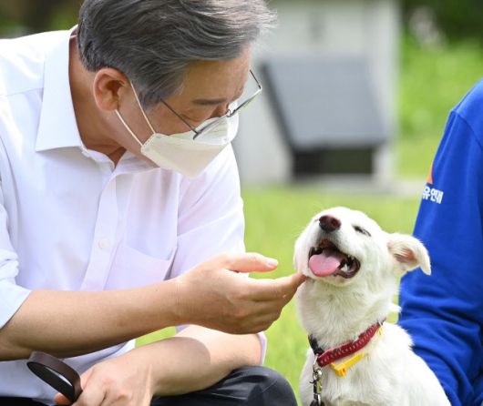 지난달 20일 경기도 고양시 덕양구 농업기술센터에서 열린 동물복지 공약 발표 기자간담회에서 동물보호센터 보호견 ‘오리’와 함께 있는 이재명 경기지사(사진=연합뉴스) |