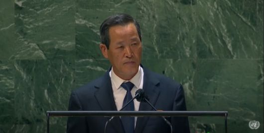 김성 유엔주재 북한대사가 27일(현지시각) 미국 뉴욕 유엔본부에서 열린 제76차 유엔총회에서 연설을 하고 있다./사진=유엔 유튜브 생중계 캡처 |