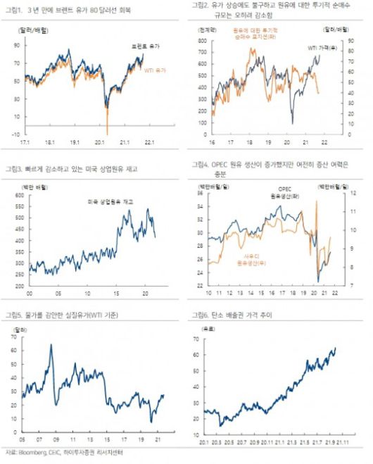 박 연구원은 "원유수요 회복 기대감에도 불구하고 원유생산이 아직 코로나19 이전 수준으로 정상화되지 못하고 있음에도 수급불안을 자극하면서 유가상승 압력으로 작용 중"이라며 "친환경경제로 전환하는 과정에서 촉발되고 있는 일시적 에너지수급난 역시 유가상승 요인으로 지적할 수 있다"고 제시했다.