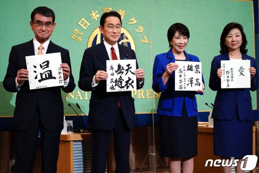 도쿄 자민당 본부에서 열린 당 총재 선거 후보 공동 기자회견에서 4명의 후보가 나란히 서서 신조를 발표하고 있다. 왼쪽부터 고노 다로, 기시다 후미오, 다카이치 사나에, 노다 세이코.© AFP=뉴스1 |