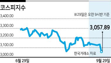 한국 증시가 3000포인트 지지의 절체절명의 기로에 섰다. 환율과 유가, 금리, 반도체 업황 등 국내외 복합 악재가 한국 증시를 강타하며 지수의 하방 압력을 키우고 있다. 29일 오전 한국 증시는 전날에 이어 이틀 연속 급락하며 3030선까지 밀리며 지난 3월 이후 단 한번도 허용하지 않았던 3000선 붕괴를 위협받고 있다. |