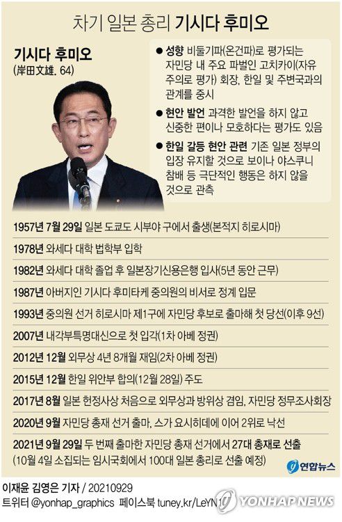(도쿄=연합뉴스) 이세원 특파원 = 일본군 위안부 문제 한일 합의의 당사자인 기시다 후미오(岸田文雄·64) 전 외무상이 내달 초 일본 총리로 취임한다.